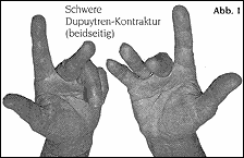 Definition der Dupuytren - Kontraktur: Bei der Dupuytren - Kontraktur (D.K.) handelt es sich um eine narbenähnliche, strangförmige, straffe Verkürzung der sogenannten Palmaraponeurose. Die Palmaraponeurose ist eine unter der Haut der Hohlhand gelegene dreieckförmige, bindegewebige Platte, die am ganzen übrigen Körper in Form einer wesentlich dünneren "Haut" (Faszie) die Muskulatur und andere Strukturen bedeckt. In der Hohlhand und an der Fußsohle findet sich diese Faszie (Aponeurose) auch im normalen Zustand plattenartig verdickt (Zeichnung 1). ![]() Die Dupuytren`sche Erkrankung wurde 1831 zuerst beschrieben durch Baron Guillaume Dupuytren, einen berühmten französischen Chirurgen. Infolge der Knoten- und Strangbildung mit häufigem Übergreifen auf die Finger kann es durch narbenähnlichen Zug der Palmaraponeurose zu einer Beugestellung (Kralle) einzelner oder mehrerer Finger kommen (Zeichnung 2). ![]() In Anhängigkeit von der Schwere der Kontraktur kommt es zu einer mehr oder weniger starken Funktionseinschränkung (Abb. 1). ![]() Ursachen der Dupuytren - Kontraktur Eine eindeutige Ursache ist bisher nicht bekannt. Möglicherweise tritt die Erkrankung in Kombination mit anderen Erkrankungen des Bindegewebes auf. Ein Zusammenhang mit Lebererkrankungen, Diabetes mellitus und Alkoholismus wird diskutiert, ist aber nicht bewiesen. Mit Sicherheit liegt eine genetische Veranlagung vor, d. h. die Erkrankung tritt familiär gehäuft auf. Die D. K. befällt Männer etwa 8 mal häufiger als Frauen und tritt meist im Alter zwischen 40 und 60 Jahren auf. Verletzungen werden als Ursache für die Entstehung nicht anerkannt, das Auftreten einer D. K. nach Verletzungen ist als zufällig anzusehen. Die Hände erleiden während unseres Lebens zahlreiche leichtere und schwerere Verletzungen, sodass im Falle eines kausalen Zusammenhanges die D. K. wesentlich häufiger auftreten müsste. Zeichen und Symptome der Dupuytren - Kontraktur Erste Zeichen sind üblicherweise Knoten in der Hohlhand, überwiegend im Bereich des 4. und 5. Fingerstrahles, seltener des 1. - 3. Strahles, die sich im weiteren Verlauf strangförmig verändern können. Desgleichen können als erste Zeichen auch Knoten im Bereich der Finger auftreten. Einziehungen der Haut im Bereich der Hohlhand und der Finger können vorhanden sein. Sie entstehen, wenn sich Fasern, die von der Palmaraponeurose ausgehen und in die Haut einstrahlen, kontrahieren. Dupuytren - Stränge sind längs, seltener quer verlaufend, von der Hohlhand ausgehend bis auf die Finger und teilweise auch bis zum Endglied übergreifend (Zeichnung 3). ![]() Diese Stränge verursachen die Beugekontraktur der Finger. Die D. K. kann sich in unterschiedlicher Geschwindigkeit weiterentwickeln, sie kann auch für unterschiedlich lange Zeit ganz zum Stillstand kommen. Rückbildungen bestehender Kontrakturen sind nicht zu erwarten. Auch wenn nur, wie meist, 1 - 2 Finger betroffen sind, kann die D. K. zur schwersten Funktionsminderung einer Hand führen. Eigenheiten der Dupuytren - Kontraktur