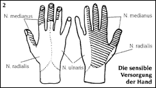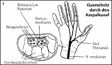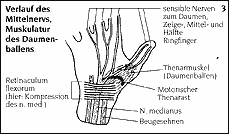 Vermeiden dieser Tätigkeiten, Arbeitspausen oder Benutzung ergonomischer Werkzeuge können die KTS-Beschwerden unter Umständen bessern. Zu entscheiden, ob ein KTS auf beruflich oder privat belastende Tätigkeiten zurückgeführt werden kann, ist sehr schwer. Zeichen und Symptome des KTS Die häufigsten Symptome sind Taubheit, Brennen und Prickeln von einem oder mehreren Fingern, in der Regel unter Ausnahme des Kleinfingers. Diese Symptome können jederzeit auftreten, sehr häufig und typischerweise jedoch nachts und am frühen Morgen und führen damit zum Aufwachen des Patienten. Besserung erreicht der Patient dann durch Schütteln, Massage und Hochhalten der betroffenen Hand sowie Anwendung von kaltem Wasser. Die Schmerzen können sich ausdehnen über den Unterarm und den Ellbogen bis in Schulter und Hals. Diagnostisch abgrenzen muß man in diesen Fällen z.B. von der Halswirbelsäule ausgehende Beschwerden. Bei Vorliegen eines KTS können die täglichen Aktivitäten mit Handgelenksbeugung und Greifbewegungen wie z.B. Telefonieren und Autofahren Taubheit und Prickeln hervorrufen. Die Gefühlsminderung kann sich äußern in Unbeholfenheit und Schwäche der betroffenen Hand. Patienten lassen Gegenstände fallen oder sind nicht mehr in der Lage, bestimmte feinmotorische Tätigkeiten oder einen festen Spitzgriff auszuführen. Zeichnung 3: Verlauf des Mittelnervens, Muskulatur des Daumenballens ![]() Der Daumenballen besteht aus der Thenarmuskulatur, diese werden, wie oben beschrieben, zum Teil vom Mittelnerven kontrolliert. Bei fortgeschrittenem KTS entwickelt sich in der Regel eine Thenaratrophie, d. h. die Thenarmuskulatur ist verschmächtigt. Als Folge sind die Beweglichkeit und die Kraft des Daumens eingeschränkt. Diagnostik des KTS In der Regel sichern die typische Vorgeschichte(Anamnese) und die klinisch-handchirurgische Untersuchung mit Feststellung der beschriebenen Symptome die Diagnose. Zur kompletten Diagnostik gehören unbedingt eine neurologische Untersuchung und die Röntgen-Untersuchung des Handgelenkes, um knöcherne Ursachen auszuschließen. Behandlung des KTS