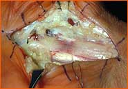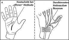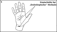 Zeichnung 4: Hautschnitt bei "Offener Methode" ![]() Zeichnung 5: Hautschnitt bei "Endoskopischer Methode" ![]() 3. "Endoskopische" Methode: Diese Methode wurde vor allem in den U.S.A. entwickelt und kommt seit einigen Jahren auch in Europa vermehrt zum Einsatz: über zwei kleine Zugänge (Zeichnung 5) wird über eine eingeführte Optik das querverlaufende Handwurzelband dargestellt und von der anderen Seite des gebildeten Kanals mit einem kleinem Messer gespalten. Vorteile: